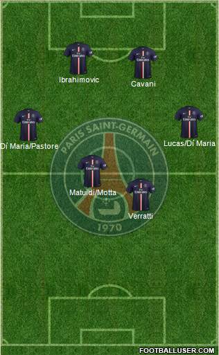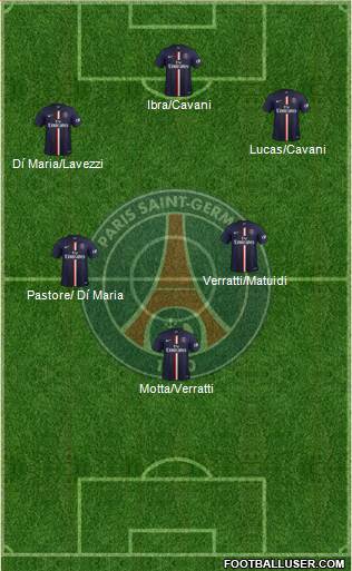 Outra possibilidade é um 4-4-2 com Cavani mais centralizado, próximo de Ibrahimovic. Dí Maria ficaria pelo lado seja esquerdo (com Lucas na direita) ou na direita(com Pastore aberto pelo lado esquerdo). Mas esse esquema obviamente dependeria da permanência do craque sueco, sendo improvável imaginar o PSG assim sem ele.